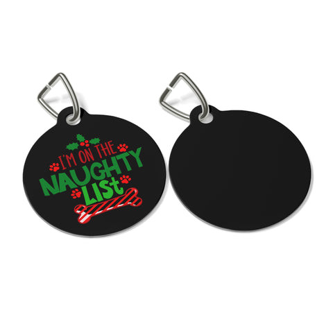 Bring a little holiday mischief to your furry friend's collar with this sturdy, glossy metal pet tag. The bold, full-color design pops against a deep black background — playful paw prints, holly, and a candy-bone graphic frame the cheeky "I'm on the NAUGHTY List" message. It’s compact and lightweight at 1" round, so it sits comfortably on dogs or cats without jingling too loudly. The tag is printed on both sides and built as a single solid piece of white-coated metal, so the design stays vivid and won’t peel or separate over time. A metal clip is included for quick attachment to any collar, making it an easy way to add seasonal flair and personality during holiday walks, parties, or family visits. Product features - Glossy full-color finish on both sides - Durable one-piece white coated metal construction - Compact 1" round size — lightweight for pets - Metal clip included for easy attachment - Design printed on both sides to keep colors vivid Care instructions - Wipe the dust or any dirt off gently with a clean, dry cloth Image by [Azindianlany